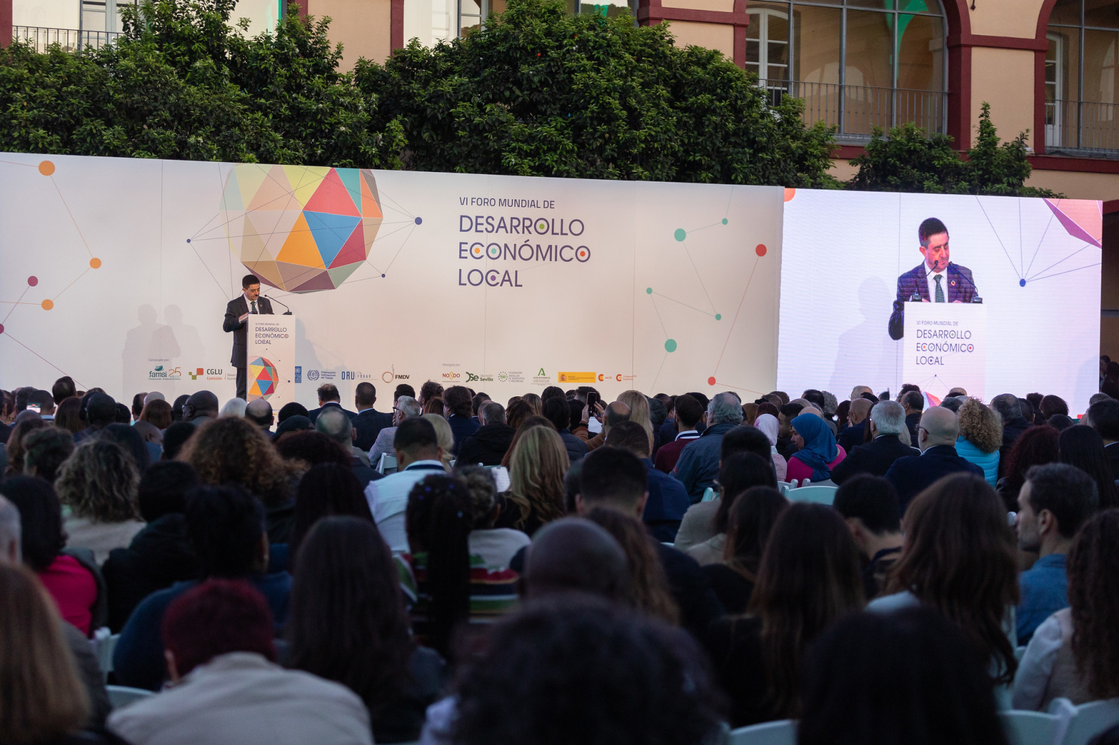 Al finalizar la jornada, se llevó a cabo la inauguración oficial del VI Foro Mundial de Desarrollo Económico Local en la sede de la Diputación de Sevilla. El acto contó con la participación de destacadas autoridades, entre ellas María Jesús Montero Cuadrado, vicepresidenta primera y ministra de Hacienda del Gobierno de España; Antonio Sanz, consejero de la Presidencia, Interior, Diálogo Social y Simplificación Administrativa de la Junta de Andalucía; Francisco Reyes, presidente del Fondo Andaluz de Municipios para la Solidaridad Internacional (FAMSI); Francisco Javier Fernández de los Ríos Torres, presidente de la Diputación de Sevilla; y Jan Van Zanen, presidente de Ciudades y Gobiernos Locales Unidos (CGLU) y alcalde de La Haya, José Luis García Martín, vicepresidente de FAMSI y octavo teniente de alcalde responsable del Área de Barrios de Atención Preferente. Durante sus intervenciones, resaltaron la importancia del foro como plataforma para promover el desarrollo económico local sostenible y fortalecer la cooperación entre territorios a nivel global.