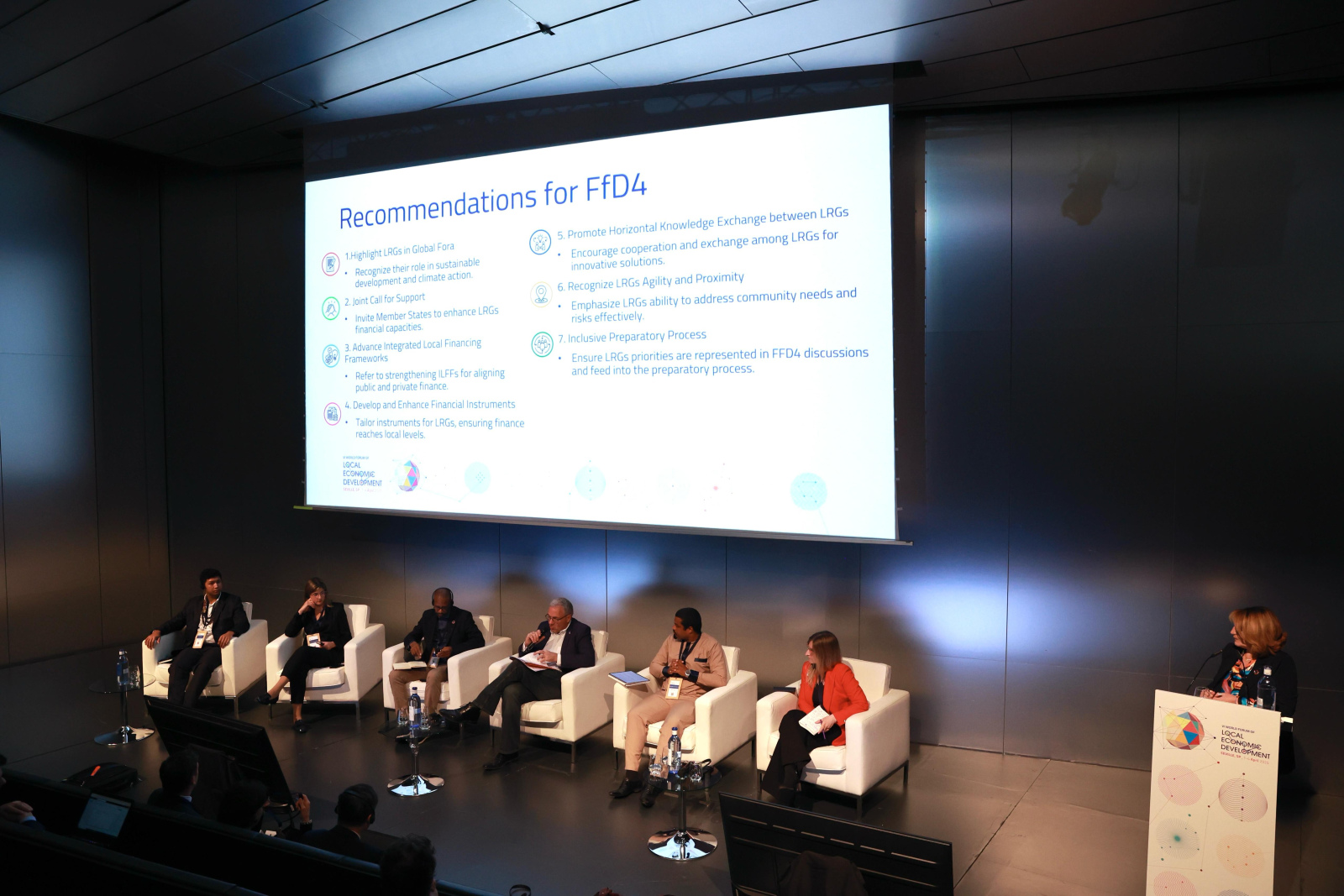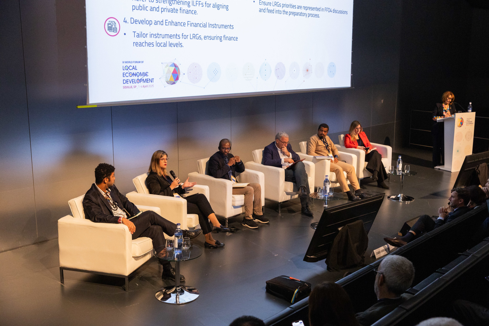 Participaron Rafael Llamas, presidente de la Red Española de Desarrollo Rural (REDR) y alcalde de Montilla; Flora Maboa Boltman, vicepresidenta de la Asociación Sudafricana de Gobiernos Locales; Rebecca Bligh, presidenta de la Federación de Municipalidades Canadienses; Julia da Motta, subsecretaria de Competitividad y Desarrollo Económico y Regional del Estado de São Paulo; y Rafael Escamilla Domínguez, presidente del Foro de Agencias de Desarrollo Regionales y director de relaciones exteriores del Instituto Valenciano de Competitividad Empresarial.
